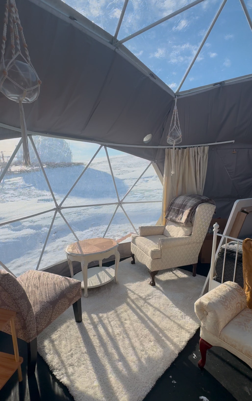 Domul din iarbă de grâu este un refugiu liniștit care îmbrățișează calmul preeriei. Stilat în creme și maro cu accente inspirate de boho, favorizează o atmosferă confortabilă și creativă. Această cupolă este mobilată cu un pat matrimonial, scaune confortabile pentru relaxare și o masă mică pentru jocuri sau mese ușoare. Cu un încălzitor, lumini și încărcător de telefon, Wheatgrass Dome oferă tot confortul vieții moderne într-un cadru liniștit, inspirat de natură.