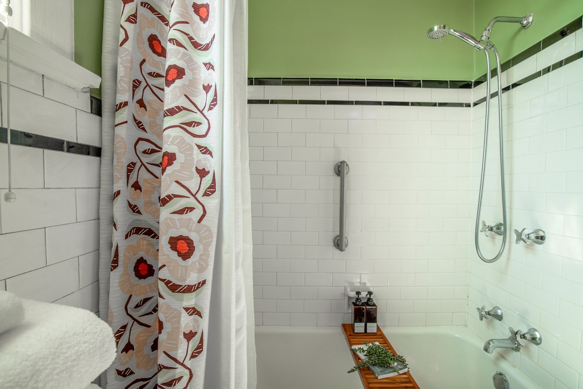 Rămâi cu stil în casa noastră colorată de șindrilă cu 2 dormitoare din anii 1930, la câțiva pași de distracția din centrul orașului. Relaxează-te lângă șemineul interior sau transmite în flux cu Wi-Fi rapid. Dotări Bucătărie completă cu cafea. Mașină de spălat/uscător automat de rufe Șemineu (bușteni de tip duraflame - nu sunt furnizate) Curte/ curte comună Parcare gratuită la fața locului Are o jumătate de baie la parter și una plină. Dormitoare Damă Complet Plus două saltele de dimensiuni normale în LR/Den Mașină de spălat / uscător automat de rufe la subsol