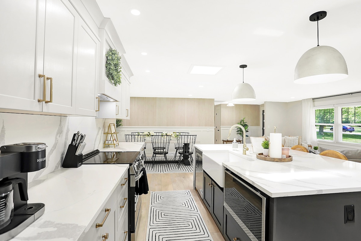 Locuință spațioasă care poate găzdui până la 8 persoane. Apartamentul principal are un pat king-size, un pat suprapus dublu, o saltea gonflabilă, un televizor de 55” cu bară de sunet, un duș modern, o cadă adâncă și un dressing. Două dormitoare suplimentare oferă paturi matrimoniale. Beneficiezi de aer condiționat/încălzire centrală, mașină de spălat/uscător, încuietoare inteligentă, detectoare de fum și extinctor. Bucătăria include un aparat de cafea Keurig pentru șederea ta.