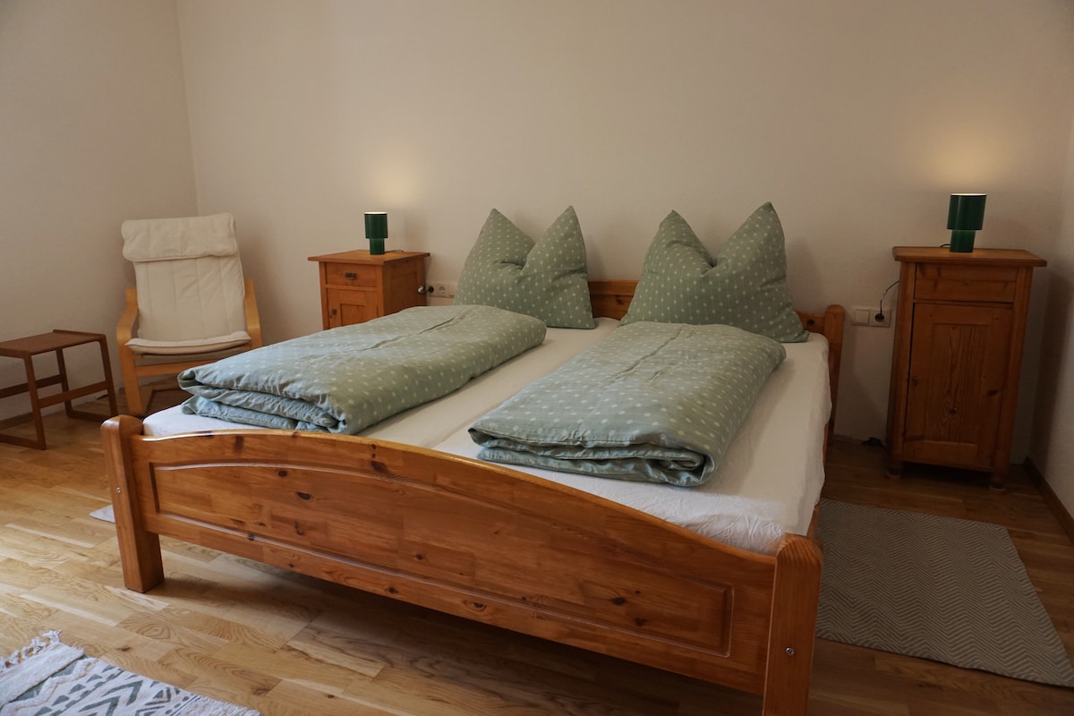 Suntem bucuroși să vă întâmpinăm ca oaspeți în apartamentul nostru cu 1 cameră de la marginea pădurii. Apartamentul mic Waldeck are o chicinetă bine echipată, o zonă de luat masa cu TV, un pat cu arcuri de 1,80 m lățime și un duș cu toaletă. Wi-Fi poate fi utilizat gratuit. Intrarea în casă este la sol, apoi cobori o scară. Apartamentul, cu o terasă de 18 mp și mobilier de relaxare, este apoi și la parter, deoarece casa noastră este situată pe pantă. Taxa turistică este, de asemenea, inclusă la prețul final.