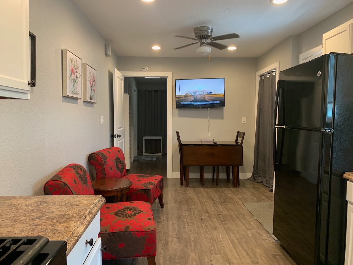 Proiectată de un designer de interior de elită, această suită de oaspeți recent renovată este dotată cu mobilier modern, TV prin cablu de 40 inch, internet wireless, o intrare privată și o curte laterală privată de 150 de metri pătrați numai pentru uzul oaspeților. Este inclusă o chicinetă cu cuptor cu microunde, cafetieră și frigider. Situat într-un cartier primordial, sigur și fermecător North Palo Alto; la 5 minute de centrul orașului Palo Alto, la 6 minute de Four Seasons, la 12 minute de Stanford și la câțiva pași de Starbucks și restaurante.