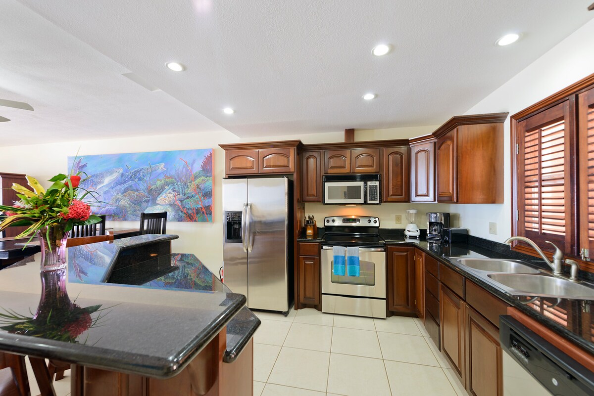 The "Five Parrots" is a massive combined unit of two top-floor penthouse lofts (231 & 232), offering 6 bedrooms, 4 baths, and two full kitchens—comfortably sleeping up to twelve guests. Enjoy breathtaking panoramic views from the huge, connected verandas. Two bedrooms are loft spaces accessed by spiral staircases. Access to the condo requires three flights of stairs (no elevator).