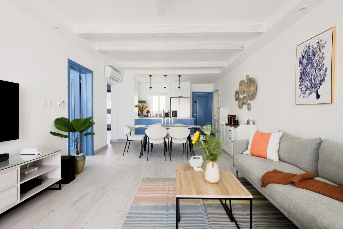 Airbnb Service fee AND electricity is INCLUDED in our pricing !! Beach Residence is just 40 barefoot steps from one of the best beaches at Bávaro Beach. 5 min a walk to fine and casual dining, a variety of shopping, grocery stores, pharmacies, spas, salons, fruit stands, bakeries, a dive shop, and so much more! We are right behind Zoho beach club to lounge, eat & drink on the white sands on your feet.