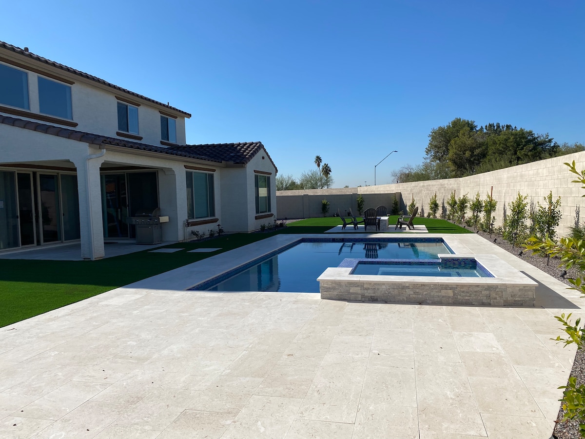 Casă de divertisment potrivită pentru familii; terasă mare acoperită cu multe locuri de relaxare, masă pentru foc, grătar Treager, cu vedere la piscina privată încălzită de 3 metri, din octombrie până în mai (inclusă). Bucătărie de chef complet utilată – cuptoare duble, plită cu gaz. Paturi confortabile, televizoare inteligente în toate dormitoarele. Articole potrivite pentru bebeluși/copii. O locație perfectă pentru escapada ta în Arizona. La doar 0,8 mile de State Farm Stadium, Desert Diamond, Westgate, cu numeroase restaurante și atracții locale, evitați traficul și mergeți pe jos până la evenimentul dvs.! Reduceri săptămânale.