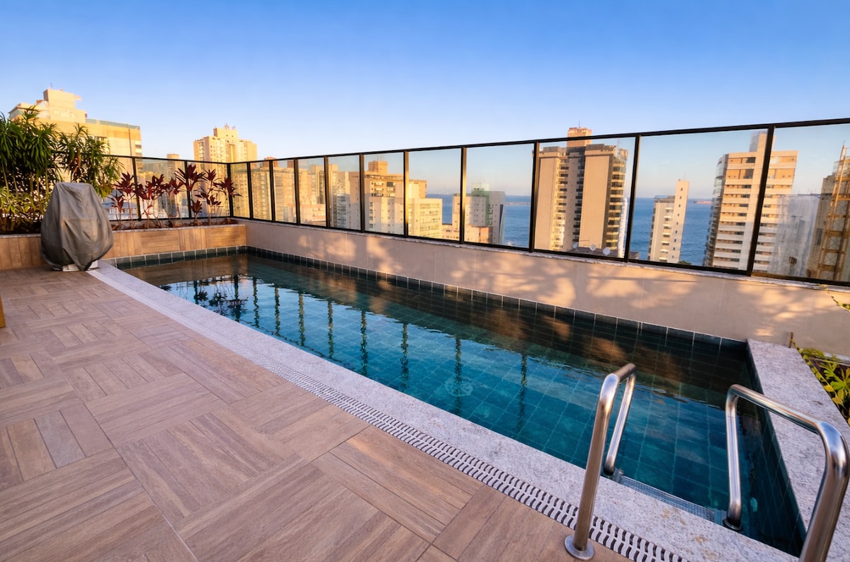 Bucură-te de un sejur liniștit în inima orașului Vitória, la câteva minute de plajă și cu recepție non-stop. În acest studio, vei avea acces la cele mai bune restaurante și baruri din oraș la Shopping Vitória, care se află la 7 minute de mers pe jos. Suntem chiar la începutul celui de-al treilea pod și ieșim spre Vila Velha. Smart TV, frigider, cuptor cu microunde, aragaz la dispoziția ta. În plus față de toate, întregul spațiu al condominiului pentru utilizare, cum ar fi o piscină pe acoperiș, spațiu de locuit, sală de gimnastică, coworking, mini-market și spălătorie.