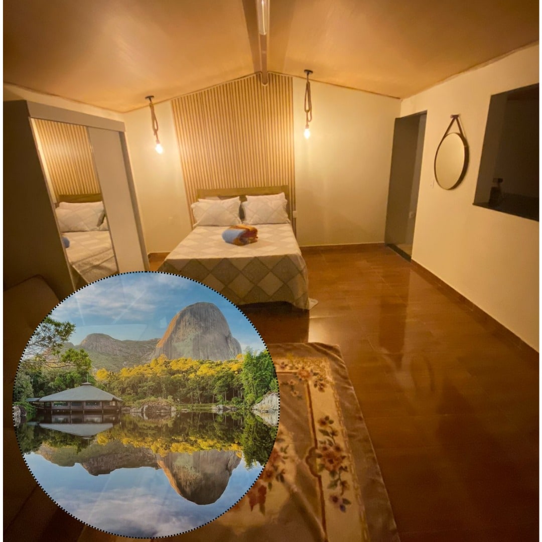 Cabană din lemn cu 2 dormitoare, baie, bucătărie completă, balcon și zonă în aer liber, disponibilă pentru până la 2 cupluri, cu un mic dejun delicios realizat manual inclus în rezervare. În plus, locația noastră este privilegiată, suntem la 3 km de centrul orașului Venda Nova do Imigrante- ES și la 13 km de Pedra Azul- ES. Vino să trăiești această experiență și să te relaxezi cu întreaga familie în acest loc liniștit, în contact cu natura. Așteptăm cu nerăbdare să vă întâmpinăm pe dvs. și pe familia dvs.