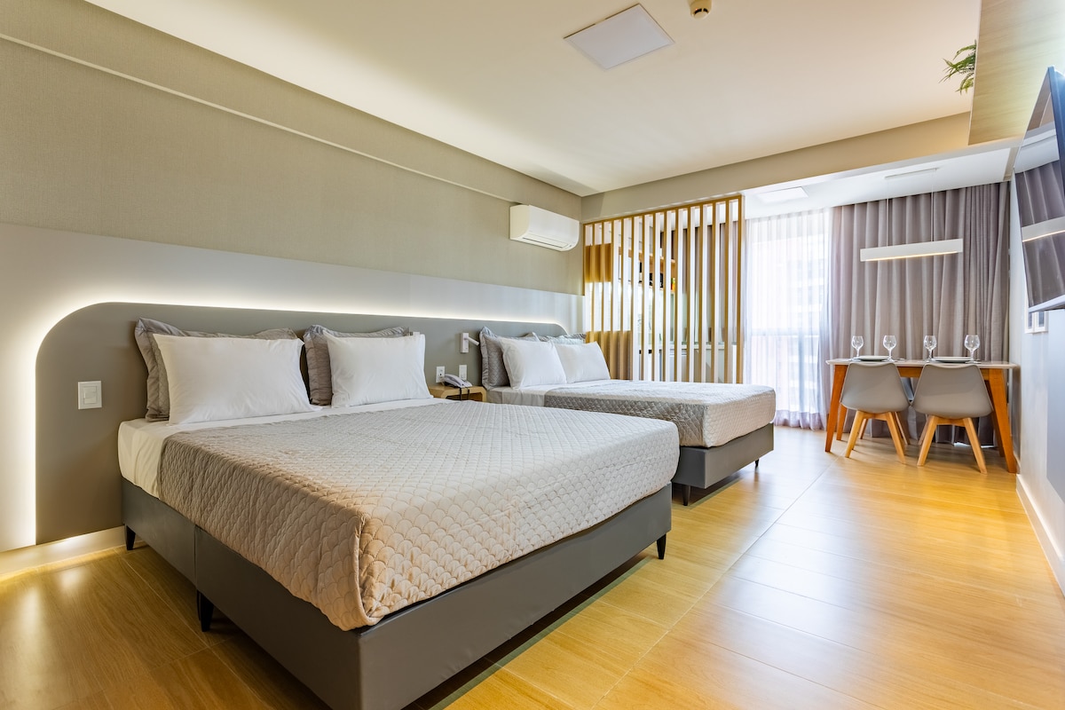 At the Cullinan Hplus Premium hotel. Very new and contemporary. Amazing location! Two malls across the street. Great tourist spots to go on foot. Charming, finely decorated and furnished unit. On the highest floor, with a beautiful view of Brasília and Asa Norte. 29m² luxury suite with king bed. Well equipped with several items for your convenience. Acoustic insulation on the windows for a great rest. Smart TV. Garage. Swimming pool, gym, sauna and restaurant. Check in 24 hours at reception.