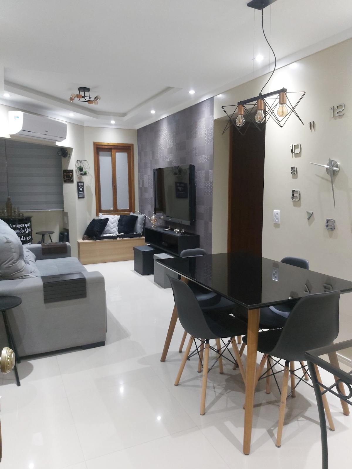 Apartament complet cu două aparate de aer condiționat nou-nouțe și în spălătoria apartamentului o mașină de spălat și un uscător automat de rufe, în living TV de 50 ", iar în apartament există un uscător de păr, în borcanul electric din bucătărie, friteuză fără cuptor cu ulei, oală cu presiune mare încorporată și un sucker pe partea de sus a aragazului, toate ustensilele de bucătărie, pentru că dacă preferați să vă pregătiți masa, o puteți face fără probleme... Internet WI-FI cu parolă.