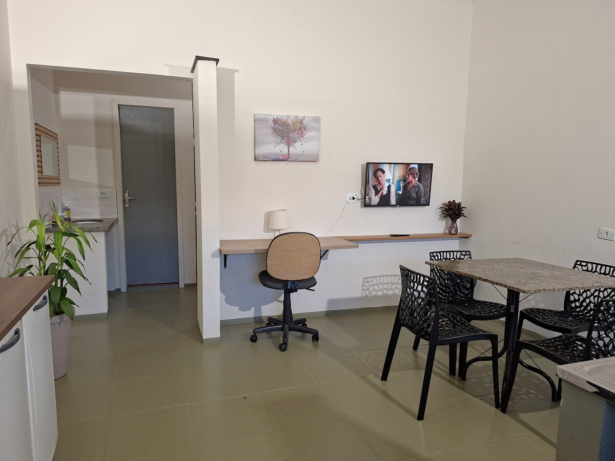 Studio modern, confortabil și complet, ideal pentru șederi de scurtă sau lungă durată. Are un pat dublu, canapea, TV, aer condiționat, bucătărie echipată, bancă de luat masa și zonă de lucru. Baie cu duș cu apă caldă și zonă de servicii cu mașină de spălat. Wi-Fi rapid și decor contemporan. Poziție excelentă, aproape de magazine și obiective turistice. Confort, practic și stil într-un singur loc!