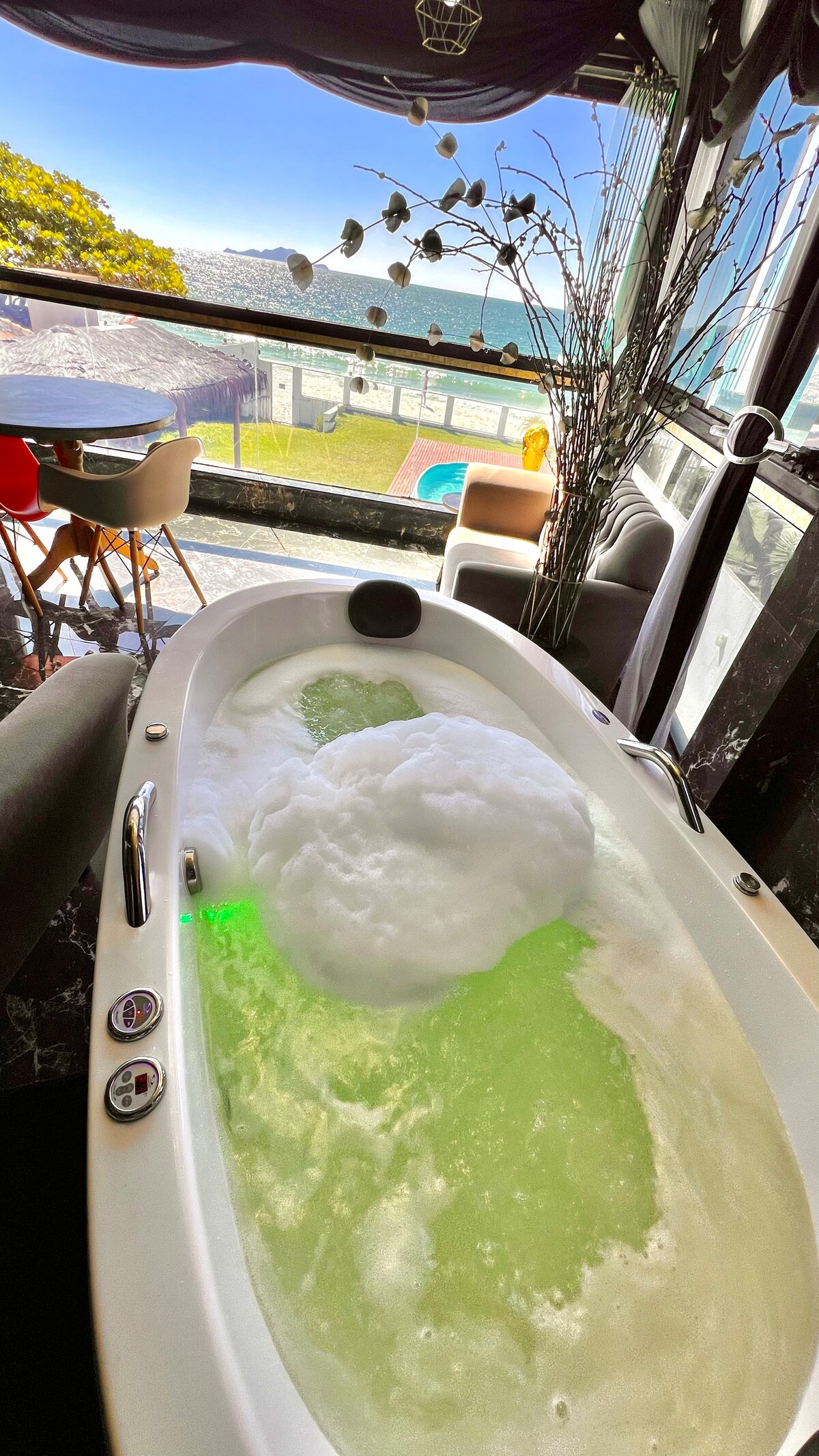 Penthouse pe plajă cu cadă și vedere la ocean.
