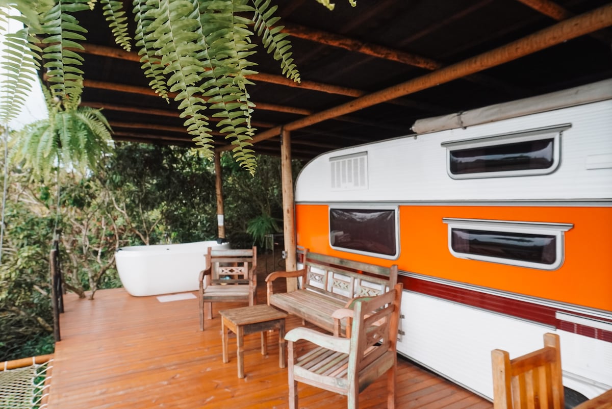 Vino și trăiește această experiență incredibilă și diferită de a dormi într-o rulotă de epocă renovată, situată în fața barajului, cu o priveliște magnifică a lacului, unde avem canapele, leagăne, hamac și caiac. Contact complet cu natura într-un teren conservat al pădurii atlantice, plin de veverițe, păsări indigene și trasee. Remorcă cu pat dublu, bucătărie, masă, canapele și baie internă cu privat și chiuvetă. Baie în aer liber cu duș. Inclus: Mic dejun, lenjerie de pat. Wi-Fi excelent