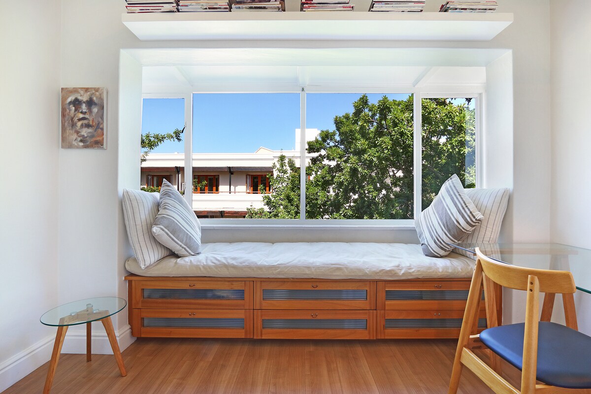 Real Stellenbosch living , la câțiva pași de centrul istoric, apartament spațios cu două etaje, grădină, cu chicinetă, living, dormitor , baie proprie, intrare privată și piscină . Fără întreruperi de energie electrică! Casa are energie solară și un sistem de baterii Situat perfect pe o stradă frumoasă mărginită de stejar, în istoricul Mostertsdrift, cu vedere la parcul Jan Marais, la câțiva pași de Universitate, Centrul sportiv Coetzenburg, aproape de trasee de drumeții și biciclete.