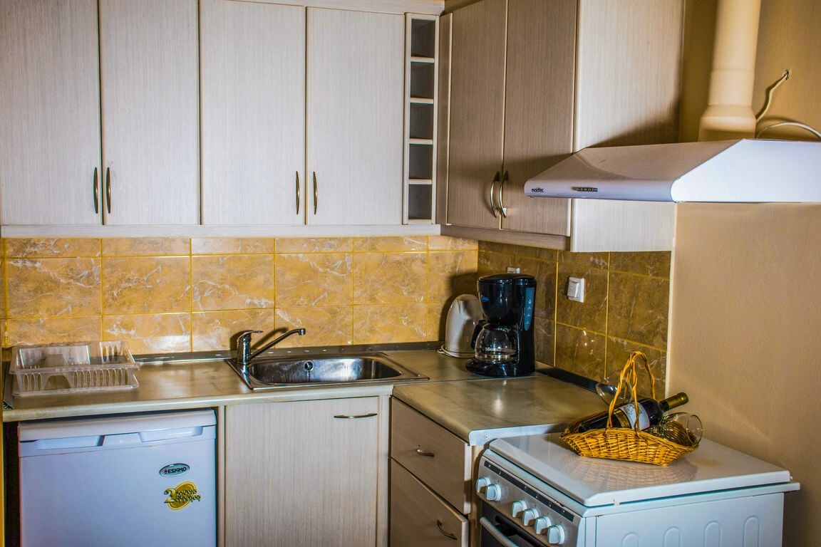 Apartament de piatră la doar 10 metri de plajă. Ferestre foarte mari pentru a vă bucura de priveliștea mării, pergolă exterioară cu loc de ședere și masă. Bucătărie complet utilată și baie confortabilă/duș. Urcând treptele de lemn ajungeți în dormitor, de unde puteți admira mai bine priveliștea mării. Prezența intensă a lemnului în combinație cu patul încorporat și canapeaua amintește de casele aristocratice din Ciclade.