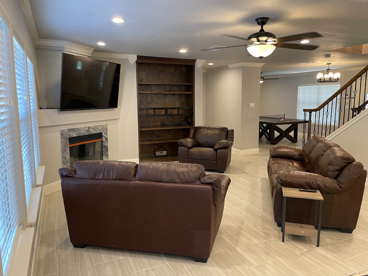 Casă cu 5 dormitoare și 6 paturi și 3 băi în prestigioasa zonă de stejar din piatră Home theater de dimensiuni normale, cu 7 scaune rabatabile din piele la etaj și sunet surround de teatru Masă de biliard din ardezie de dimensiuni normale, de 2,4 metri, și masă de ping-pong la parter 2 televizoare de 75 inchi în livingul de la parter 1 dormitor la parter pat matrimonial cu spumă cu memorie și televizor de 50” Baie completă la parter Televizoare în toate camerele Dormitor principal la etaj cu baie proprie și 2 paturi matrimoniale cu spumă cu memorie și televizor de 65” Celelalte 3 dormitoare au toate paturi matrimoniale cu spumă cu memorie și TV de peste 50”