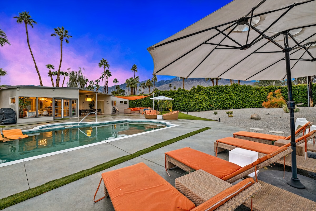 Evadează în casa noastră modernă elegantă de la mijlocul secolului, amplasată în inima Palm Springs, unde te înconjoară frumusețea liniștită a deșertului. O casă emblematică pe acoperiș fluture de Palmer & Krisel, construită de Alexander Construction Co. Amestec de neegalat de viață elegantă în interior, farmecul captivant al mediului deșertului înconjurător. Amenajare spațioasă, ideală pentru escapade de o săptămână. Petrece serile adunate lângă groapa de foc, bucurându-te de nopțile răcoroase din deșert și de întinderea vastă de stele de mai sus.