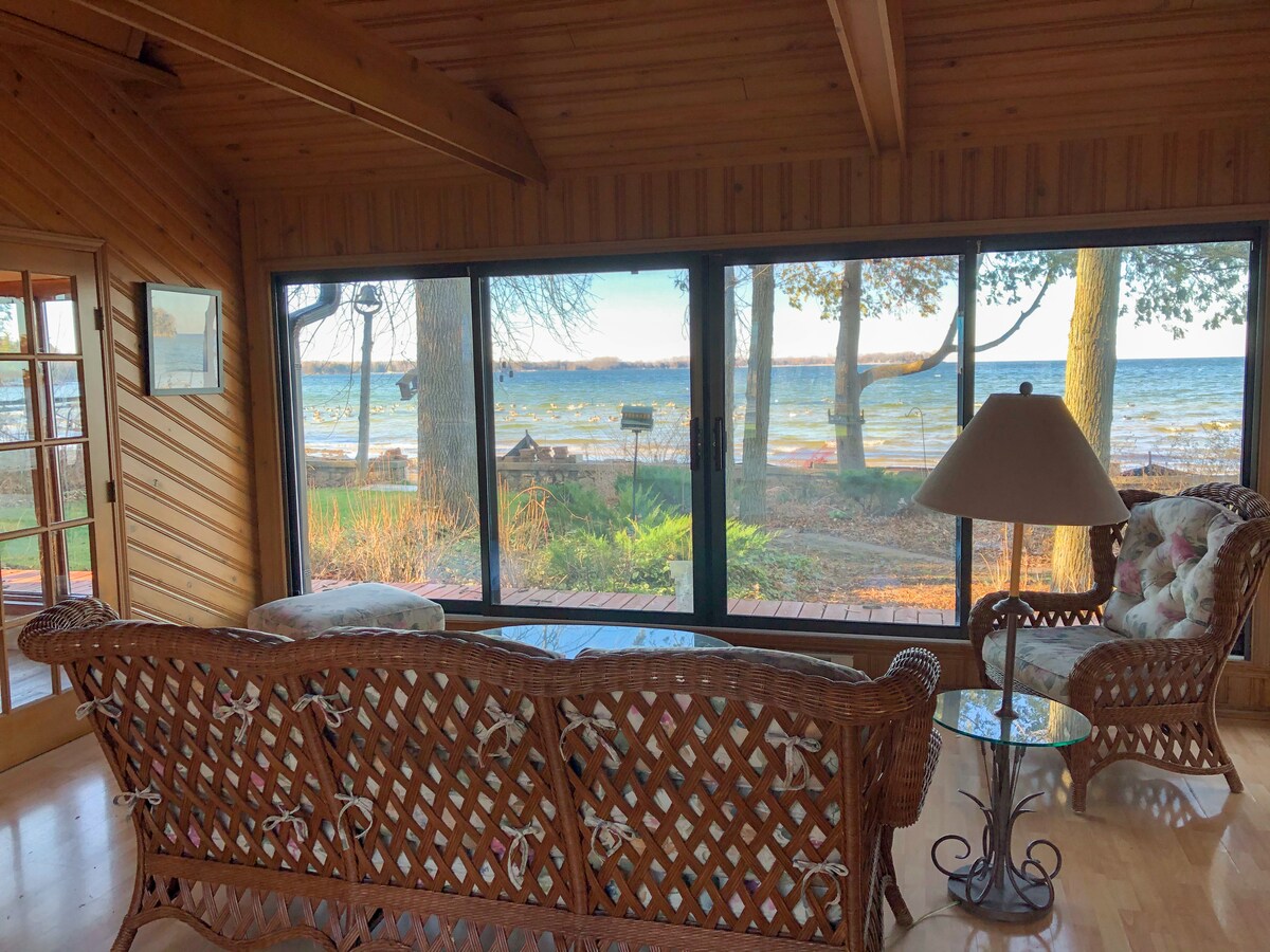 Beautiful 4 season, private 2 bedroom Knotty Pine Cottage located on the shores of Lake Michigan just 10 yards away from water in Sturgeon Bay, WI. 2 BR/1 bath cottage with beautiful stone, wood burning fireplace. A fully equipped kitchen with high bar dining which seats 8. Lots of living space with leather sectional and full size hide-away sofa sleeps 2, Main Guest Room 1 w/ queen log bed and Guest Room 2 with full size log bunk beds, Large screen tv, wifi and panoramic lake view.