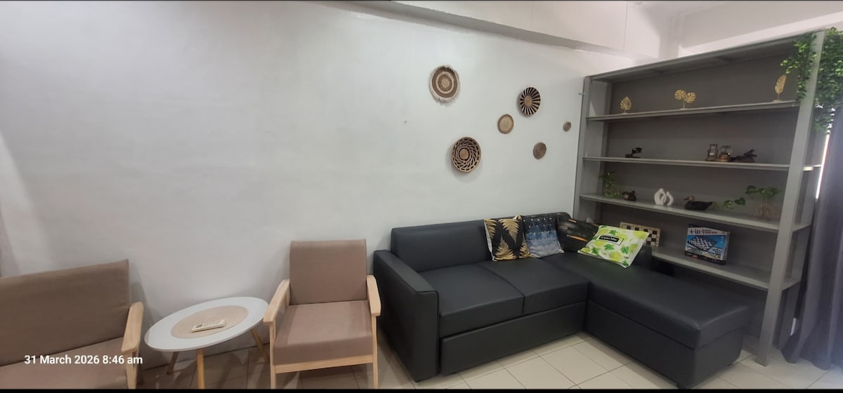 Un studio luminos, luminos, de 28 mp, cu o bucătărie bine utilată, WiFi, smart TV, parcare stradală gratuită într-un cartier liniștit, pe deal, în mijlocul copacilor. - La etajul 3 al clădirii apartamentului (32 de trepte în sus) - distanță de mers pe jos până la mini-mart, capelă, spălătorie, piscină - Distanțe de conducere: - Plaje: Toate mâinile-5 minute și Camayan-15mins -Nearby restos: Acea-3mins & Rali 's-8mins -Ocean Adv /Zoobic : 12-15 minute -Royal Duty Free / Pure Gold /Starbucks-10-12 minute -Aeroport: 2 minute -CBD: 15 minute - Check-in independent