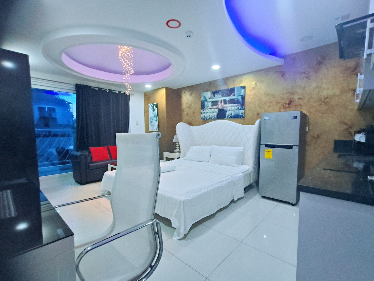 Studio la etajul 2, cu terasă deasupra piscinei, pachet Executive Internet, televizor Samsung Smart 4K de 55", bucătărie complet utilată, cu vase noi, ustensile și tacâmuri. Cafetieră nouă, cuptor cu microunde. O unitate de nefumători cu balcon cu vedere la zona piscinei. La Grande Residence a devenit cea mai bună alegere atât pentru business, cât și pentru turiștii care vizitează Clark Freeport și zona Pampanga. Relaxează-te în acest spațiu calm, sigur și elegant.