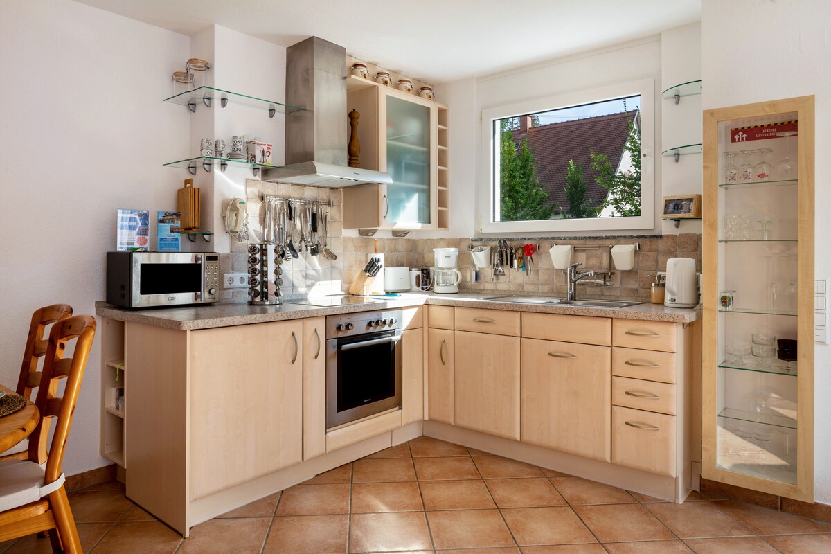 Casa noastră cu priveliști minunate este situată în Winzerdörfchen Betberg. În dormitor e un pat dublu, în living, o canapea extensibilă oferă încă 2 locuri de dormit. Bucătăria noastră este complet utilată. Există o cadă cu duș și o toaletă pentru oaspeți. Mașina de spălat este la subsol. Parcarea este la casă, în port există spațiu pentru biciclete. Există un grătar și un vas pentru foc. Excursiile includ: Pădurea Neagră, Basel, Colmar, Europapark Rust