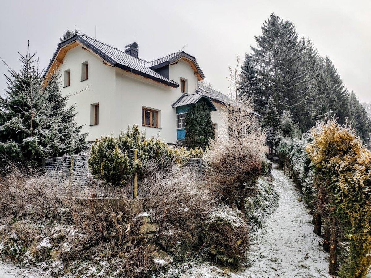 Bucură-te de o ședere excelentă de toamnă sau de iarnă cu wellness în aer liber cu o cadă cu hidromasaj, saună și cadă de răcire, toate cu o vedere magnifică. Vara, te vei bucura de piscină, șezlonguri, tenis de masă, cadre de alpinism, o casă pentru copii cu chicinetă. Groapă de foc, scaune acoperite, grătar. Casa este situată la mică distanță de gară și de stațiunea de schi Kouty, unde există un restaurant, pizzerie și o sală de bowling. Oferim condiții reduse pentru schi și un autobuz de schi gratuit către stațiunea Kouty.