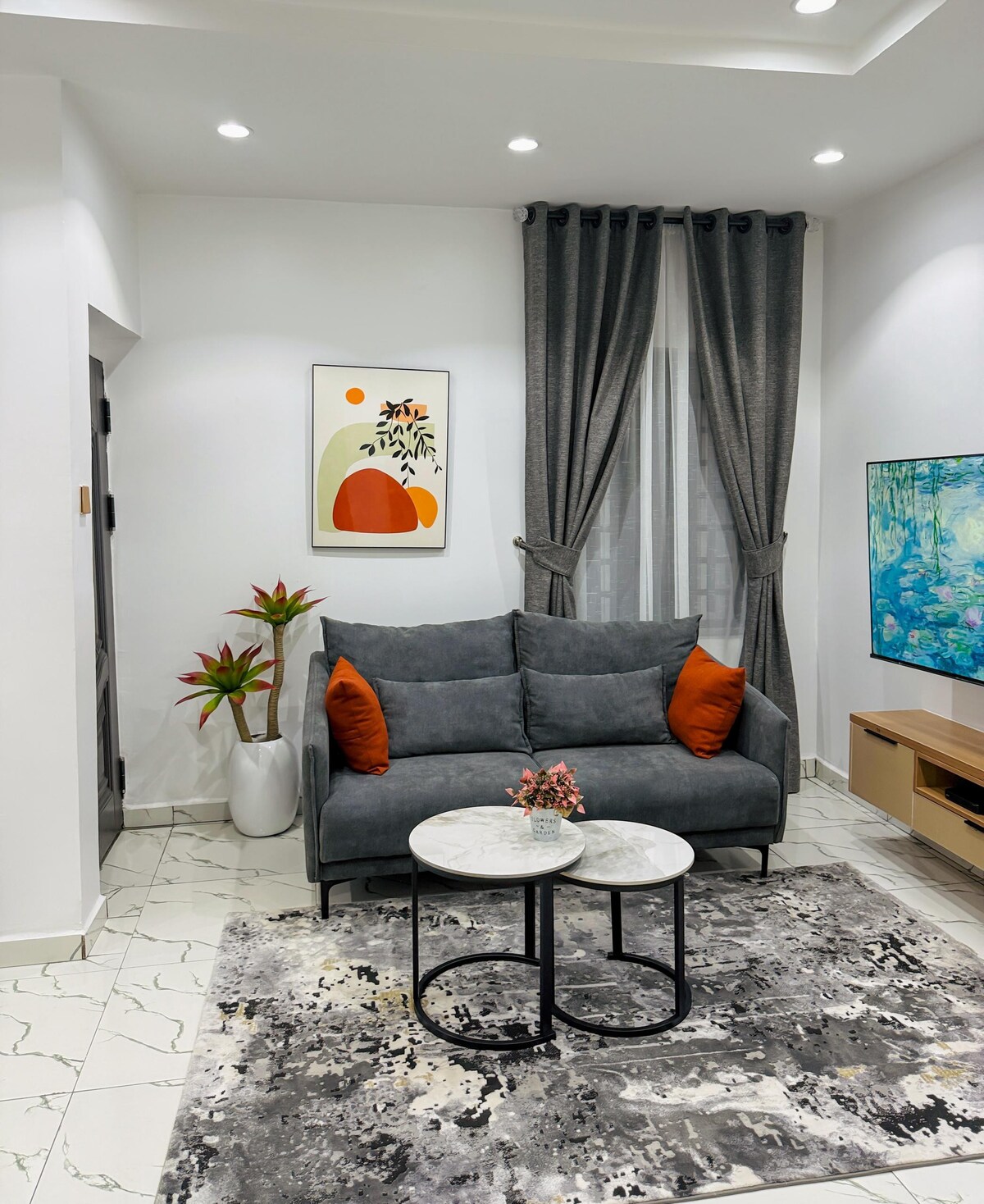 Relaxează-te în acest apartament liniștit, de designer, cu 1 dormitor din Jahi, Abuja. Cu tonuri calde, pământești, un lounge confortabil, un balcon privat și o bucătărie complet utilată, este perfect pentru cupluri, călători singuri și lucrători la distanță. Bucură-te de Wi-Fi rapid, interioare elegante și o atmosferă liniștită la doar câteva minute de agitația orașului. Casa ta modernă departe de casă.