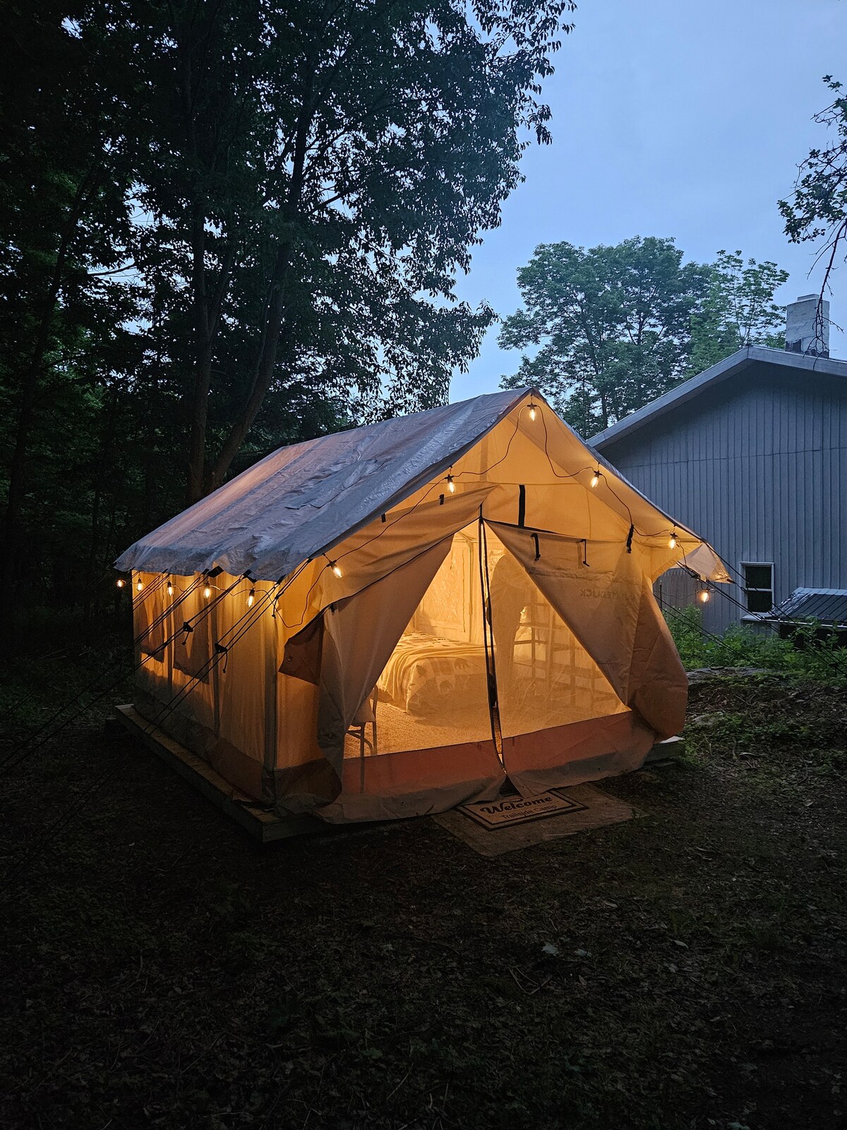 Un loc de glamping pentru grupuri mici, familii sau cupluri care doresc să evadeze. Acest camping găzduiește un cort de pânză de 10’x12' și un cort mai mic pentru un spațiu suplimentar de dormit. Situat chiar lângă pârâu! Minute până la Appalachian Trail, Big Creek Winery, Beltzville Lake, Blue Mountain Ski & MTB Resort, Jim Thorpe și multe altele! Vino pentru sporturi nautice, drumeții, ciclism montan, pescuit sau doar pentru a te bucura de locul Creekside! Ești binevenit să te stropești în pârâu și să te răcorești.