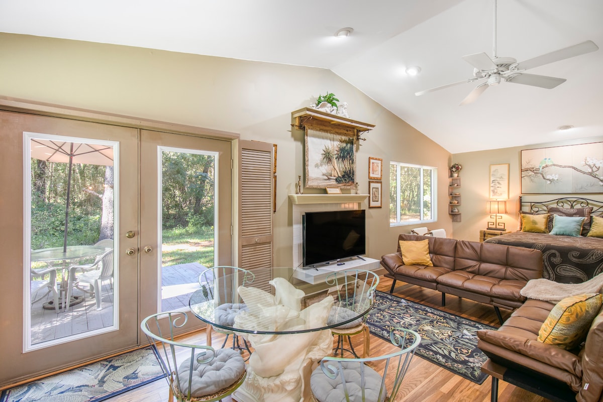 100% Private everything! Hanes Haus, historic Main St. Shops, spas, tea room, dining, etc. Close to I-75. TOTU 4 mi. Dwntn Gainesville 15 mi. Near 4 Springs. Dine in room or alfresco. Qn bed, huge bathfm w/18ft skylight over soaker tub. Well Equipped kitchenette + coffee, tea, oats. QUIET AC. Fanimation fan/light. Electric fireplace, Smart TV(remotes for all!) Ded. WIFI, ADA ramp. Wheel luggage car to room all flat. 1/2 acre fenced property. View car from room. Safe Norman Rockwell-ish street!