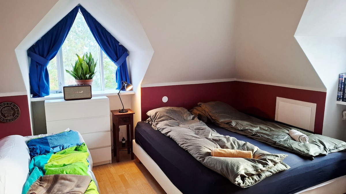 Ultimul etaj, situat central și bine conectat la stațiile de autobuz și drumurile principale. Bucătăria a fost complet renovată în 2022. Există ferestre și priveliști în toate direcțiile. În camera mare, renovată în 2025, există un pat de 200x180cm și o canapea lungă, pentru o a treia persoană. Ferestrele, orientate spre sud și vest, au „perdele opace” pentru a evita soarele de la miezul nopții. Există cărți despre Islanda și un difuzor bluetooth. Un dulap și un birou. Poți împrumuta un televizor mic. Autorizație de închiriere islandeză: HG-4537