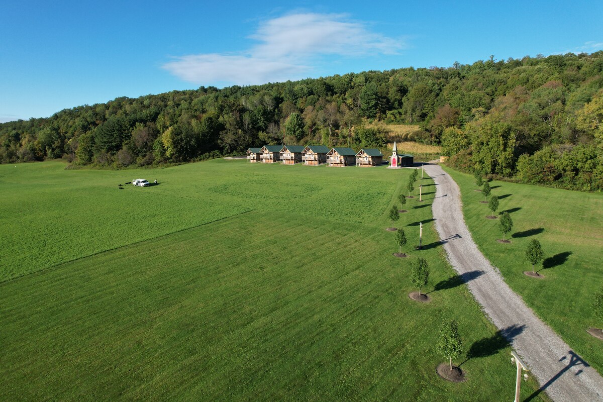 Wine & Pine – The Seneca Shed este un studio confortabil, rustic, cu un pat complet (queen în curând), căldură, aer condiționat, minifrigider și un combo de cafea/plită/tostator. Bucură-te de s'mores, gustări și o scurtă plimbare până la o baie privată. Relaxează-te lângă groapa de foc, scaunele Adirondack sau masa de picnic cu vedere la câmpurile fermei. O evadare unică și liniștită în Finger Lakes. **situat pe traseul Seneca Sledders - acesta trece prin câmpul de pe proprietatea noastră**