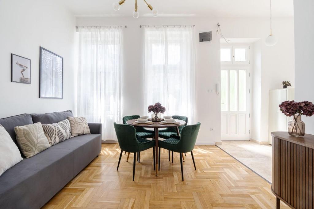 Apartamentul proiectat a fost complet renovat cu design modern într-o casă frumoasă de la începutul secolului. Apartamentul este la etajul 1, accesibil cu lift și are o atmosferă foarte liniștită și calmă. Situat într-una dintre cele mai la modă zone ale Budapestei, cu cele mai bune baruri, pub-uri, restaurante, muzee, galerii, buticuri de îmbrăcăminte de designer, magazine și arhitectură istorică la ușa ta. Apartamentul cu aer condiționat are o bucătărie complet utilată și o baie modernă.