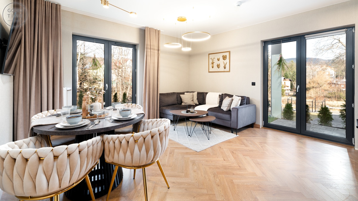 Un apartament exclusivist de 70m2 cu o saună în apartament și o ieșire de grădină într-o vilă nouă cu vedere aurie la Munții Giant de la toate ferestrele. Terasă imensă (40 m²) perfectă pentru relaxare. Un living cu o bucătărie bine echipată și o canapea extensibilă pentru dormit. Dormitor cu baie proprie și saltea de înaltă calitate. Două băi la cel mai înalt standard. Cartier liniștit, pitoresc. Aproape de magazine, restaurante, trasee și atracții din Szklarska Poręba. Loc de parcare cu încărcător electric.