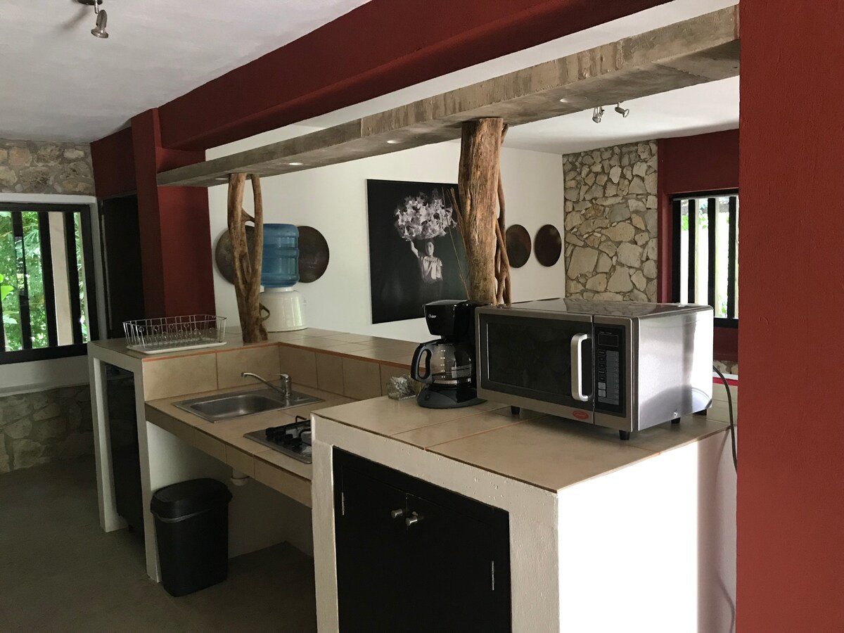 Ubicado a menos de 20 min. de la zona arqueológica y a un costado del restaurante "El Huachinango feliz". Ideal para disfrutar del contacto con la naturaleza en un ambiente cómodo, seguro y discreto.