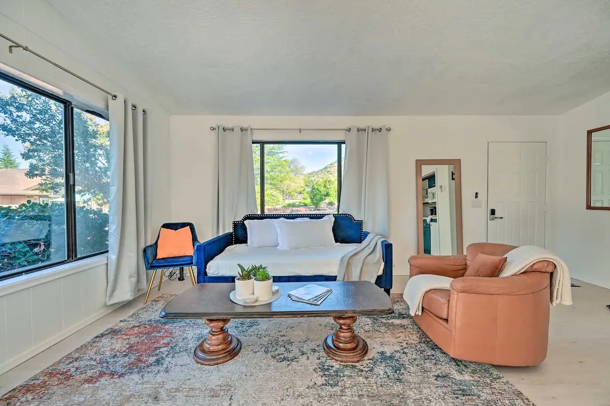 Gorgeous 1 bedroom Guest House newly updated ! Spacious bedroom with NEW Queen bed, super comfortable. Travertine bath with walk in rain shower. New kitchenette that has everything you need. Spacious living room with pull out sofa bed, wall mounted Smart TV and very fast Wi-Fi. Small desk area to plan your adventures and gaze at Thunder mountain. Central location just off the 89A. Whole Foods, shops, close by. View of the Airport Vortex from the bedroom . Water is local Artesian well water!