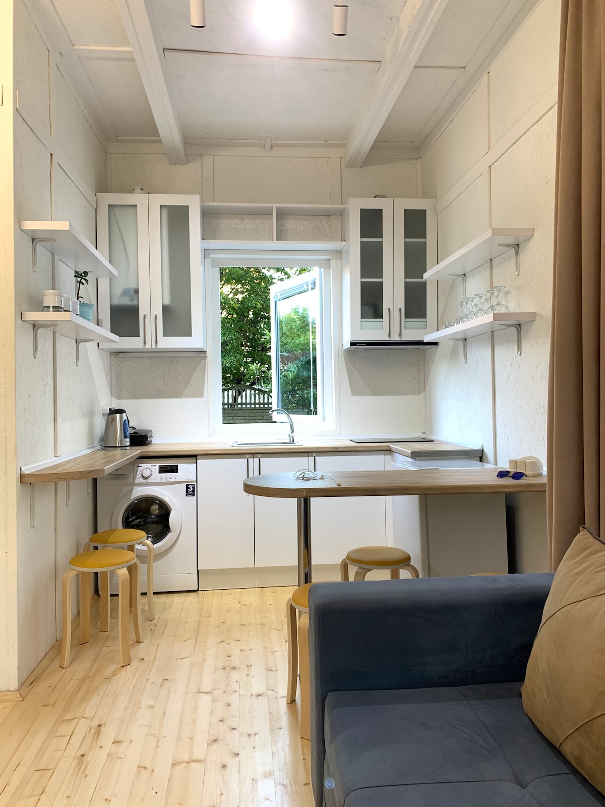O întreagă cabană confortabilă cu curte izolată situată în Kaprovani, la 450 de metri de plajă. Acest loc este pentru cei cărora le place liniștea și se bucură de un mediu liniștit și verde, cu sunete de păsări dimineața și broaște seara. De asemenea, ocazional vaci și cai care trec pe drumul cu pietriș. Există două magazine alimentare mici și unele cafenele sezoniere în zonă, la 7 minute de mers cu mașina de gara Ureki și piața de pește, la 25 de minute de mers cu mașina de cel mai apropiat oraș port Poti.