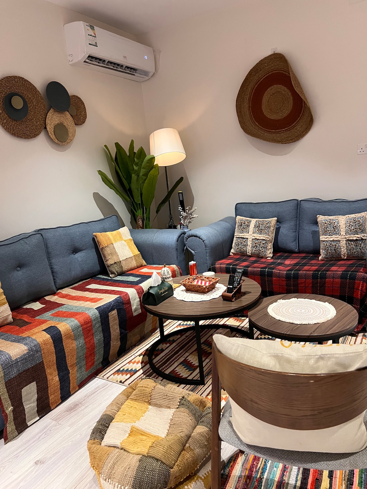 Bucură-te de un apartament de lux boem cu 1 dormitor + living în East Taif, situat ideal în apropiere de Makkah, Al Hada, Al Shafa și Universitatea Taif. Concepută pentru confort și intimitate, cu un interior distinctiv. Include Smart TV, bucătărie utilată, mașină de spălat, frigider, pat premium, iluminat moale, Wi-Fi rapid și check-in independent. Excelent pentru călătorii de afaceri sau șederi relaxante, aproape de serviciile esențiale. == Scări la proprietate; este posibil să nu fie potrivite pentru oaspeții în vârstă. Atmosferă liniștită, memorabilă, cu accente artistice - sosire ușoară cu pași de check-in independent!