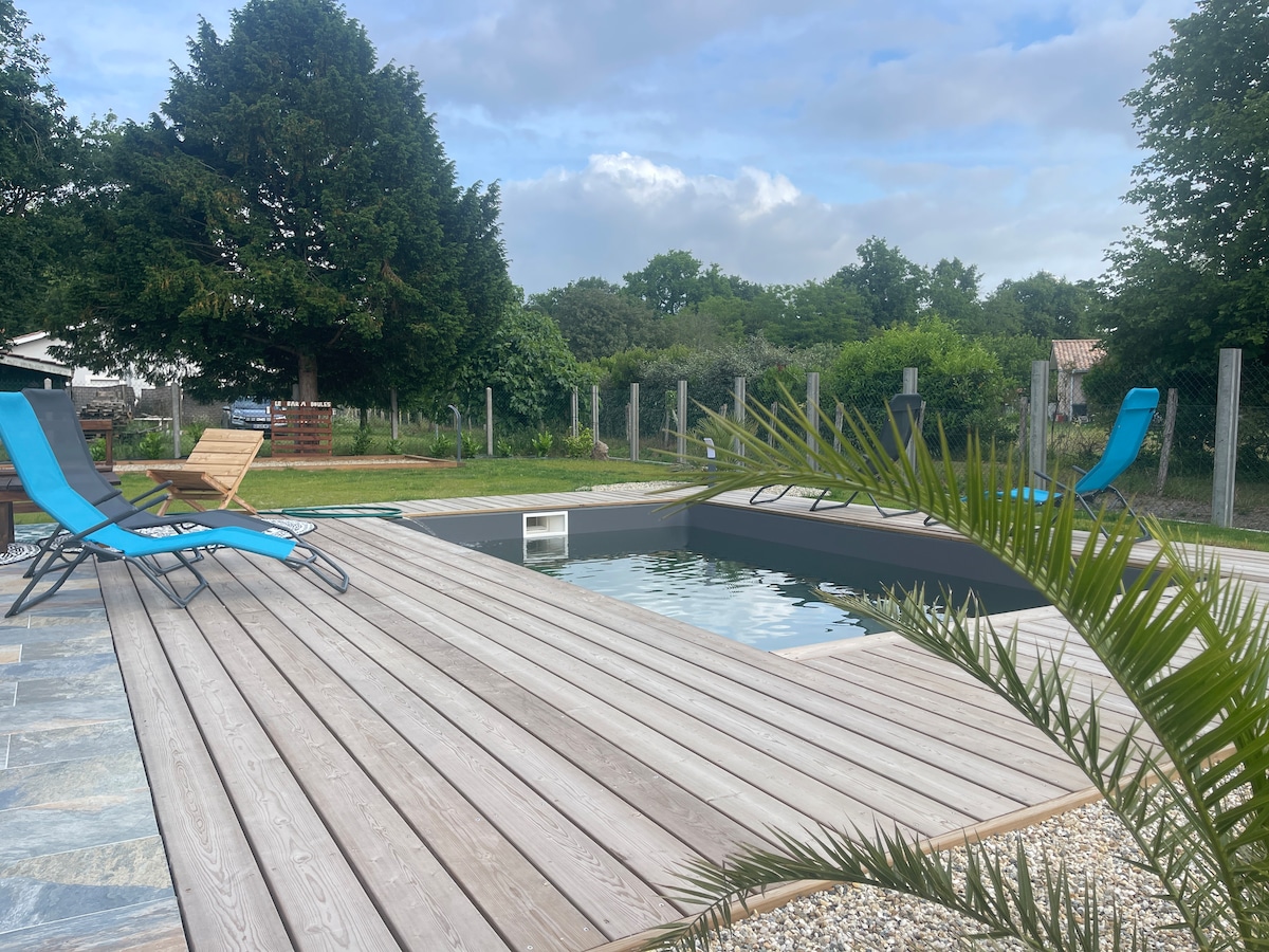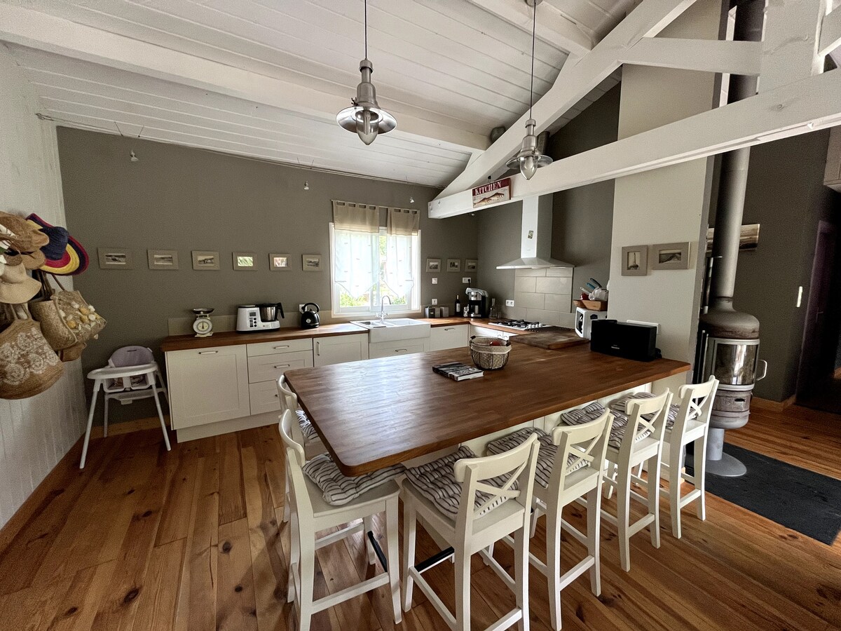 Această pivniță de vinuri autentică situată în inima orașului North Medoc, la 17 km de plaje, oferă un spațiu de locuit atipic de 800m2 care conține locuința noastră și o cabană de 215m2. Vei avea trei dormitoare cu aer condiționat, fiecare cu o baie și toaletă separate, un living imens cu bucătărie echipată. În cele din urmă, separându-te de casa noastră, vei găsi o sală de jocuri cu o masă de biliard americană și... un bol de patinaj! Bicicletele și plăcile de surf pot fi, de asemenea, disponibile.