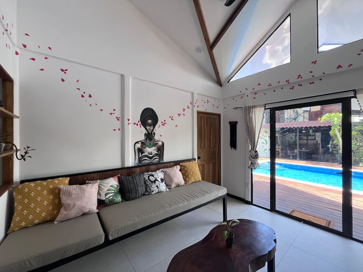Escape to paradise in our boutique home nestled in the lush jungle of Costa Rica, where nature & comfort blend effortlessly. Our eco-friendly haven is a short drive from stunning swimming and surfing beaches, plus mouth-watering restaurants. The house is naturally ventilated, with an open, airy feel inviting the sounds of the jungle inside. While the bedrooms feature refreshing air conditioning, the rest of the house embraces the tropical climate, screening fresh air in & venting humidity out.