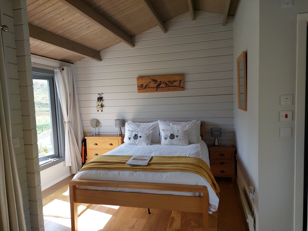 Sorry - Children over 9 only. Red Mountain Cottage is beautifully and quietly situated on the edge of Carbost village, with stunning views overlooking Loch Harport and towards the Cuillin Mountains. This is a small, modern, but very well appointed cottage/cabin has been lovingly created to a high specification, including handmade beds and sills & a feature wall. The cottage sleeps 3, but is ideal for couples seeking a romantic break, as well as for sight-seeing, walking and climbing.
