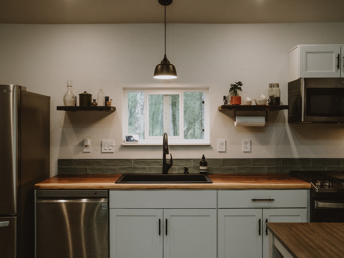Spacious studio in a quiet Alaskan neighborhood. Full bathroom with subway tiled bath/shower combo for soaking after a long day of fishing. A roomy kitchen with a gas stove/oven, microwave, toaster, sink, fridge, table, chairs and a rustic bartop with stools for hanging out. Tucked around the far end of the room is a queen sized bed & closet. The living room is furnished with a large comfortable sofa that can accommodate another person. *2.5hrs away from Denali Natl Park*