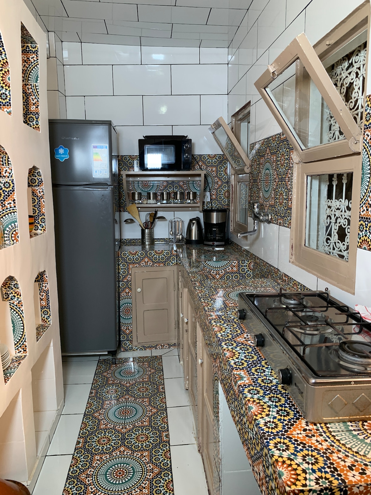 Acest apartament este finisat la standarde înalte, și se face în design tipic marocan, cu utilizarea de materiale tradiționale. Este o combinație frumoasă de calitate, confort și atmosferă marocană. Apartamentul este situat la parter, conține o bucătărie complet utilată și potrivită pentru gătit acasă cu cafetieră, prăjitor de pâine, frigider etc., atrium cu zonă de luat masa, living, baie și două dormitoare. Are, de asemenea, o terasă comună mare pe acoperiș, cu diferite locuri de relaxare și o baie.