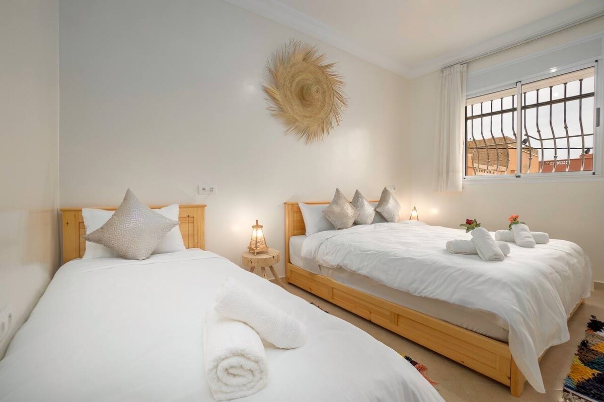 Lasă-te captivat de autenticitatea marocană cu acest apartament somptuos de la etajul 3, cu priveliști uluitoare ale orașului Agadir. La 200 m de Al Had Souk și la 5 minute de plajă cu taxiul, această locuință combină farmecul tradițional și confortul modern. Cu cele două dormitoare duble, o suită de mireasă cu terasă privată, un living cu aer condiționat și o bucătărie americană, este perfect pentru o ședere imersivă. Mic dejun și curățenie incluse pentru o experiență marocană unică