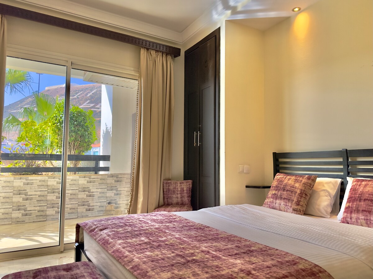 Bine ai venit în partea ta de Maroc autentic, unde farmecul tradițional întâlnește paradisul surferilor! Apartamentul 🏄♂️ nostru de pe plajă, foarte bine cotat, oferă combinația perfectă de stil local și confort modern. Spațiul 🏠 tău privat: • 2 dormitoare confortabile • Salon marocan tradițional cu Smart TV • Baie privată completă • Wi-Fi rapid (108 Mbps) Paradisul 🌅 comun de pe acoperiș: • Bucătărie complet utilată pentru oaspeți • Vedere uimitoare la ocean și munte • Scaune relaxante pe terasă • Loc perfect pentru vizionarea apusului de soare