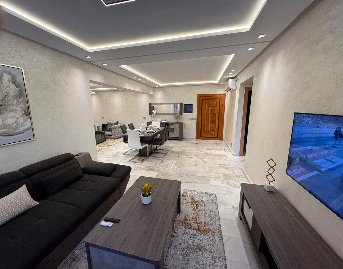 Appartement spacieux ,ensoleillé , climatisé situé au cœur de la ville , sans vis à vis , face au Mall Ibn Batouta, supermarchés carrefour , boutiques de renommée, spa, restaurants, café et équipé correctement pour vous offrir un séjour confortable et paisible . à 10 minute à pieds de l'ancienne Medina. 2 minute à pieds de la Marina. 5 minute à pieds au port de Tanger ville. 25 minutes en voiture à l'Aéroport Ibn-Batouta 5 minute de la gare ferroviaire Venez confirmer mes Avances !!!