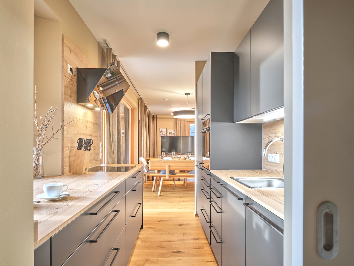 Willkommen im Penthouse GIPFEL-GLÜCK. Die Krönung der Sunleitn-Residenz: 107 m² mit offenem Wohn-/Essbereich und beeindruckendem Sichtdachstuhl. Voll ausgestattete Küche und Zugang zur großzügigen Terrasse mit 180° Bergpanorama in absoluter Privatsphäre. Entspanne in der privaten finnischen Altholzsauna mit Blick in die Berge. 2 Schlafzimmer, ideal für bis zu 4 Gäste.