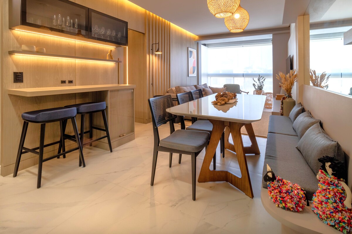 Relaxează-te în acest spațiu calm și elegant. Rezidențial la standarde înalte, pe malul mării din Novo Campeche, cel mai important cartier actualmente din Florianópolis. Cartier confortabil cu străzi pavate largi, pistă de biciclete, plajă potrivită pentru surfing și kitesurfing. Aproape de o brutărie, supermarket, camion cu produse alimentare, salon de înfrumusețare și galerie cu opțiuni gastronomice, poți face totul pe jos. Condominiul are un lounge cu masă de jocuri, piscină și centru de fitness la rezervare prealabilă