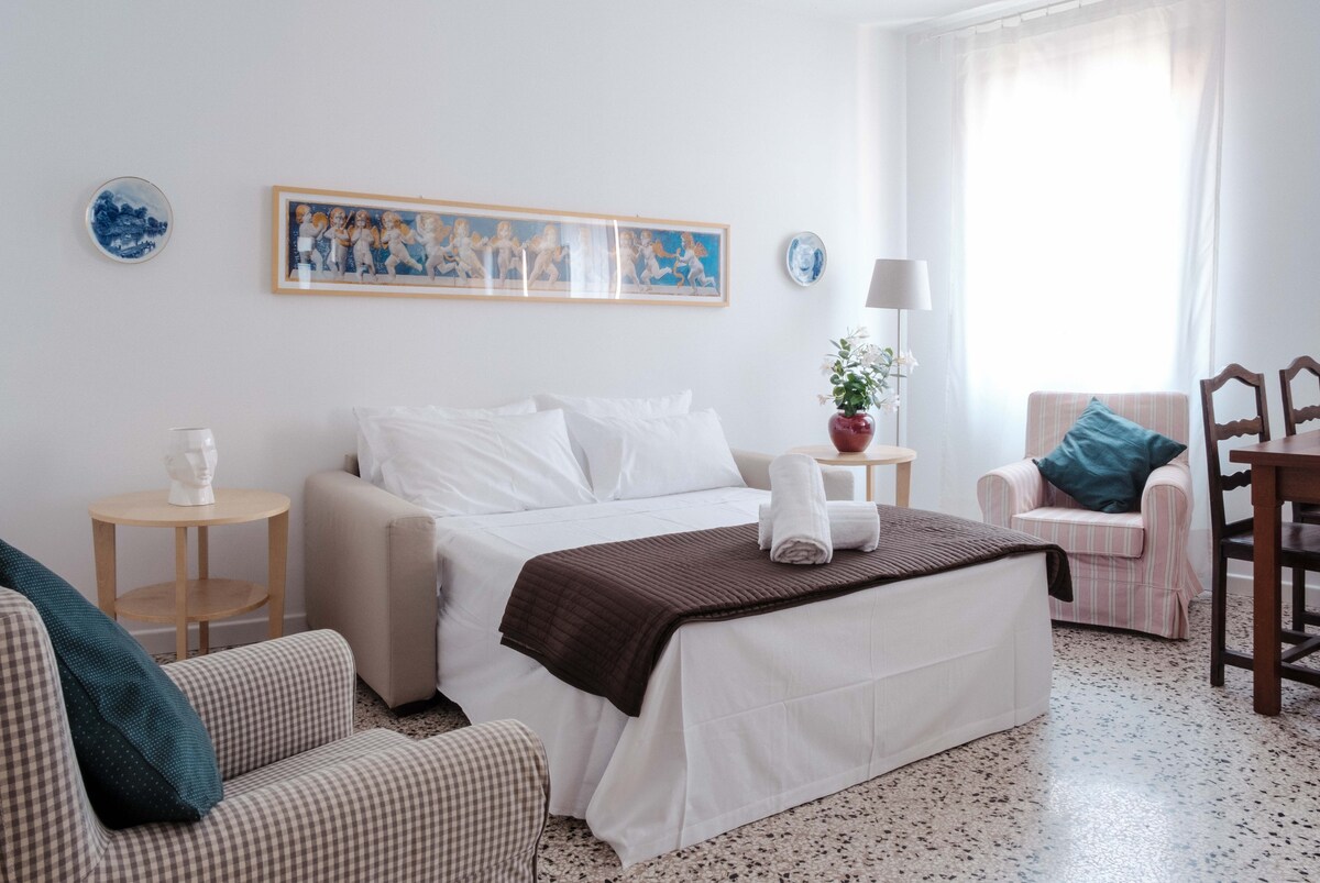Apartament tradițional într-o clădire venețiană veche. Apartament cu două camere mobilat în stil tradițional, la etajul al treilea. Living-sufragerie, bucătărie utilată și complet utilată: mașină de spălat rufe, mașină de spălat vase, cuptor cu microunde, fierbător, cuptor, espressor, aragaz cu inducție, dormitor cu pat dublu (160x200cm), baie cu duș. Încălzire/răcire de sine stătătoare, TV, WIFI. Cir=027042-LOC-12196 CIN=IT027042B4W83SESVY
