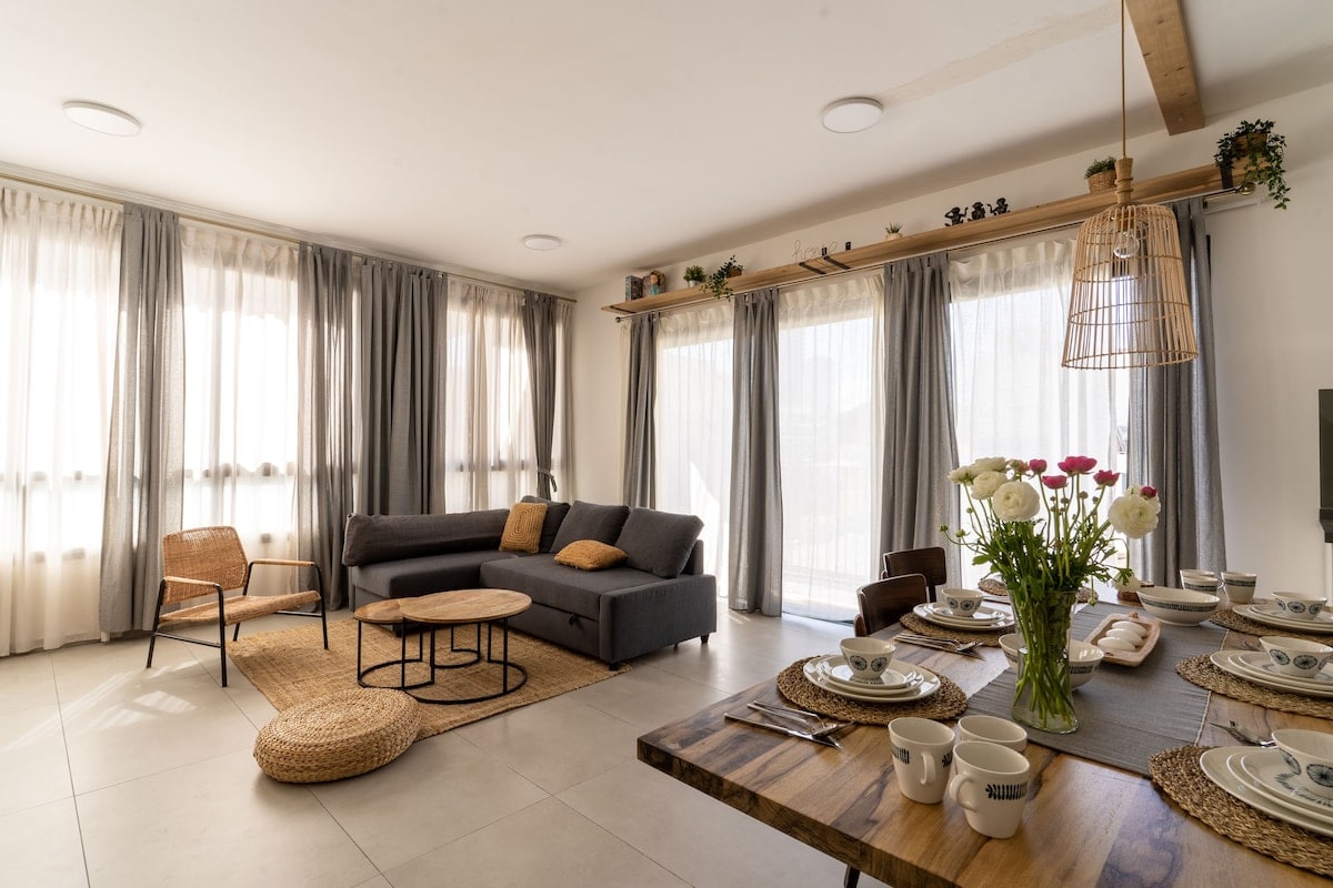 Spațiul Acest apartament elegant, dar confortabil, de lângă strada Bograshov, este locuința ideală pentru vacanța ta. Designul modern și aspectul deschis întâmpină căldura și relaxarea. Terasa foarte mare este foarte frumoasă pentru a lua cina sau doar pentru a citi o carte pe un scaun frumos. Acest spațiu are 2 dormitoare cu o baie și poate ocupa până la patru oaspeți confortabil.
