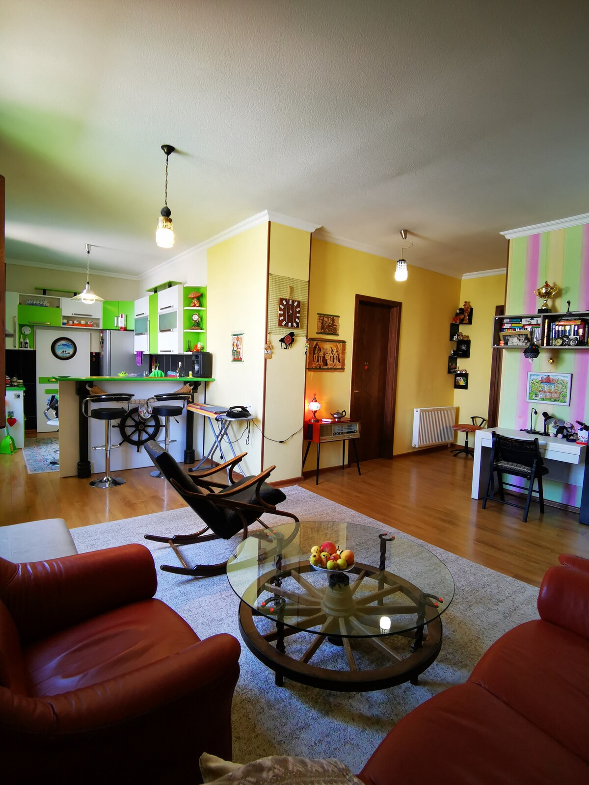 Poziția este aproape de centru, cu vedere superbă la munți și la Alazani Welly. Din centru durează 5 minute de mers pe jos până la destinație în mai puțin de minute. Locuința de închiriat este la primul etaj al locuinței noastre și conține 2 apartamente private, cu balcon comun imens, care are vedere la aspectul spațios și la priveliștile uimitoare ale peisajului înconjurător. În plus, atenția noastră la detalii și mobilier asigură o ședere confortabilă și luxoasă pentru oaspeții noștri.