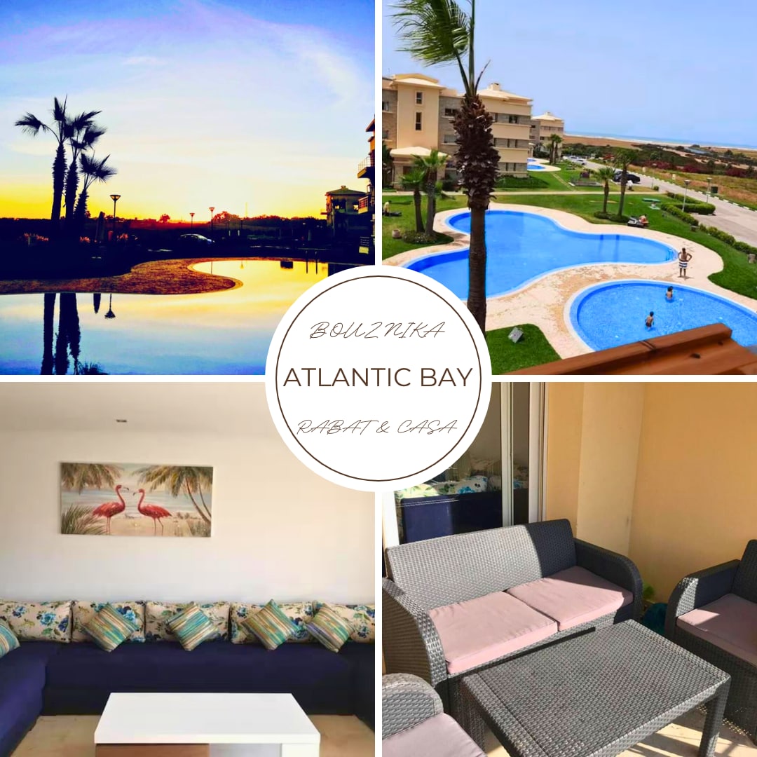 Apartament panoramic scăldat de soare, cu terasă orientată spre ocean și piscină privată mică. Suită principală cu TV și baie. Al doilea dormitor cu acces la terasă. A doua baie. Living confortabil, TV de 50”, Netflix și Wi-Fi, bucătărie echipată cu bar, aer condiționat central. Reședință închisă și securizată, cu parcare și garaj. Piscină comună mare deschisă pe tot parcursul anului. Plaja Cherrat și Bouznika, la câteva minute distanță. Calm absolut. Ideal pentru familii și cupluri.