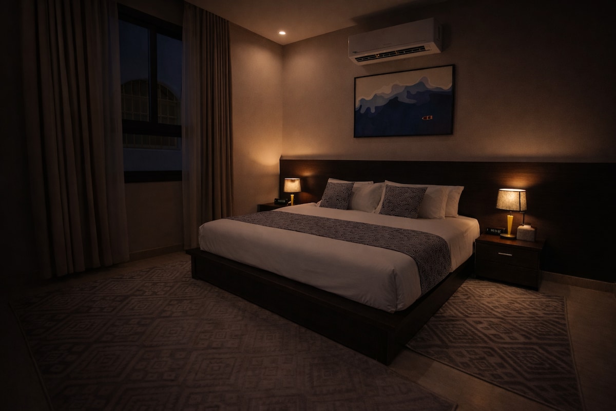 شقه فندقية مريحه مكونة من غرفة نوم وصالة
